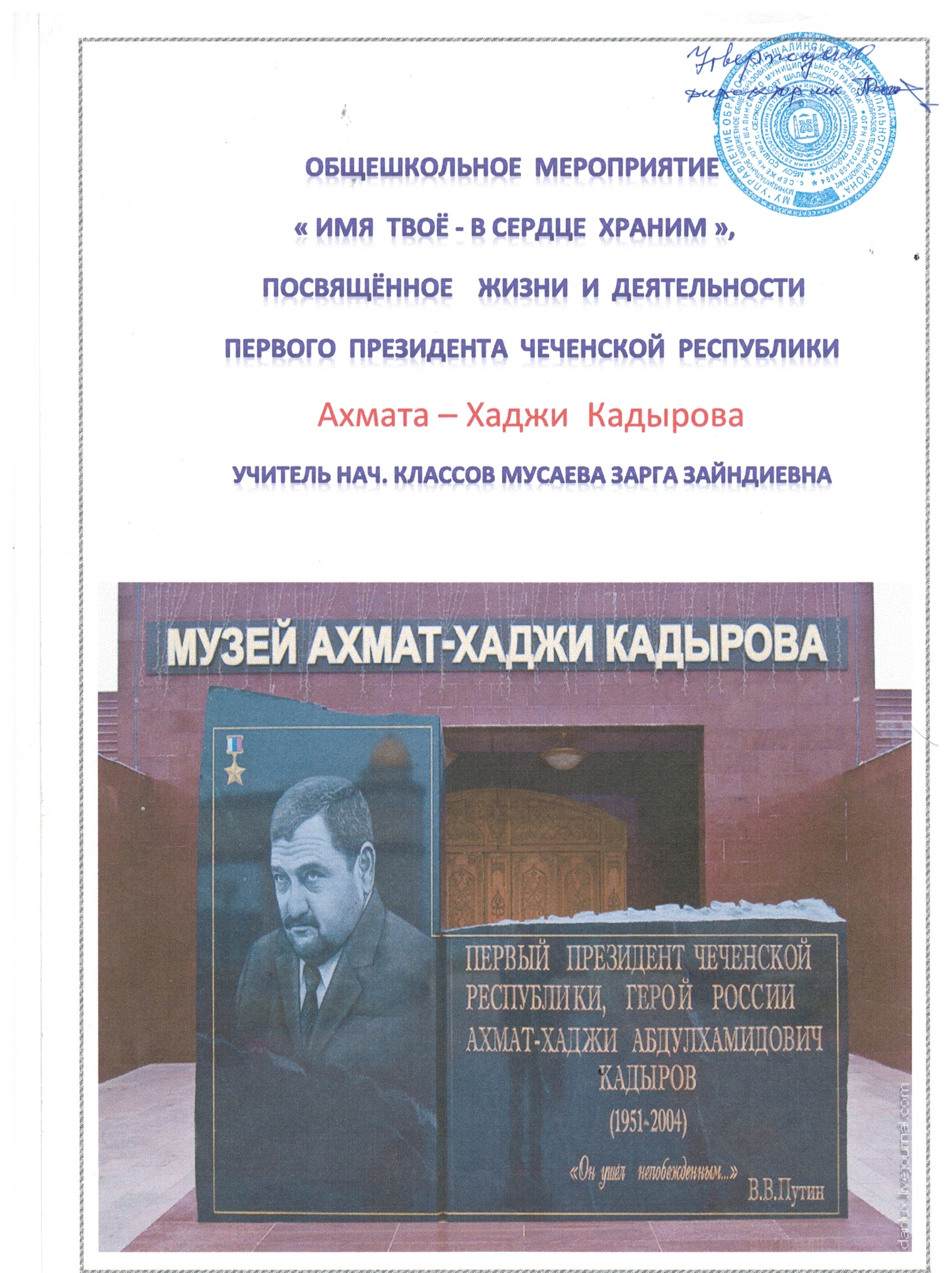 12.05.2016Общешкольное мероприятие «ИМЯ ТВОЕ –В СЕРДЦАХ ХРАНИМ», посвященное жизни и деятельности первого президента Чеченской Республики Ахмата-Хаджи Кадырова.