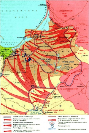 В ходе Восточно-Прусской операции утром 14 апреля войска 3-го Белорусского фронта возобновили наступление и прорвали оборону противника на флангах фронта. К исходу дня 2-я гвардейскаяпродвинулась вперед на 15 километров, а 43-я — на 10 километров. Под натиском введённой в сражение подвижной группы отступление противника стало приобретать панический характер. Угроза выхода 2-й гвардейской на тылы немецких войск, которые оказывали упорное сопротивление частям 5-й и 39-й армий, вынудило их к отступлению. Стремясь избежать расчленения своих войск, немецкое командование приказало им 14 апреля начать отход в юго-западном направлении к Пиллау.По приказу Георгия Константиновича Жукова на всей линии соприкосновения войск 1-го Белорусского фронта с противником 14—15 апреля была проведена разведка боем.Совинформбюро: В течение 14 апреля на Земландском полуострове северо-западнее и западнее КЁНИГСБЕРГА войска 3-го БЕЛОРУССКОГО фронта с боями заняли более 60 населённых пунктов…На территории Чехословакии восточнее и юго-западнее города ГОДОНИН войска 2-го УКРАИНСКОГО фронта, продолжая наступление, заняли населённые пункты МА-ЗУР, КУЖЕЛОВ, МАЛАЯ ВРБКА… Севернее и северо-восточнее ВЕНЫ войска фронта с боями заняли на территории Австрии населённые пункты ХОХЕНАУ, ГРОСС ИНЦЕРСДОРФ…Западнее ВЕНЫ войска 3-го УКРАИНСКОГО фронта, продолжая наступление, форсировали реку ТРАЙЗЕН и заняли город ГЕРЦОГЕНБУРГ…