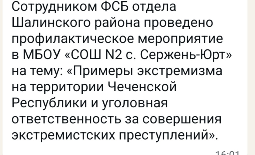 Сотрудником ФСБ отдела Шалинского района проведено профилактическое мероприятие в МБОУ «СОШ N2 с. Сержень-Юрт» на тему: «Примеры экстремизма на территории Чеченской Республики и уголовная ответственность за совершения экстремистских преступлений».