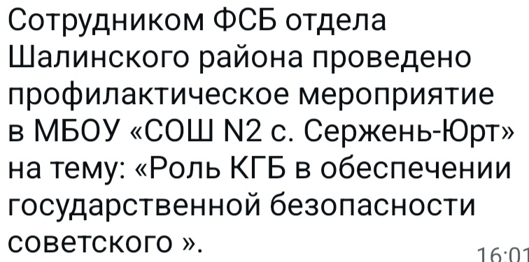 Сотрудником ФСБ отдела Шалинского района проведено профилактическое мероприятие в МБОУ «СОШ N2 с. Сержень-Юрт» на тему: «Роль КГБ в обеспечении государственной безопасности советского».